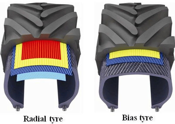 - Radial ply tires - have a carcass with a ply of cord at an angle of 90° in direction of travel. To stabilize the surface of the tire tread, reinforcing cord belts are superimposed on the carcass.