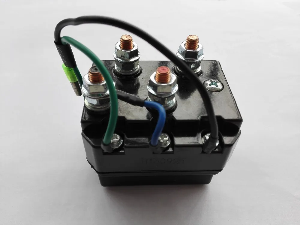 This contactor uses only black and red color-coding. Others use yellow and blue as well.All ATV winches will have one, and its job is to switch between sending a positive and negative electric current to the winch. This is what determines which way the engine turns.