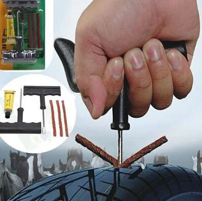 There are all kinds of tire plugging kits, but you want the most complete tire repair kit which comes with the plugs, the installation tool, and the reamer tool. Some flat tire repair kits just come with the plugs and installer, but the reamer tool is a necessary component to a good repair. Some tire plugging kits also come with liquid cement. You can use it or not, but the cement helps make a more permanent repair.
